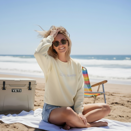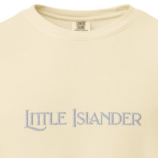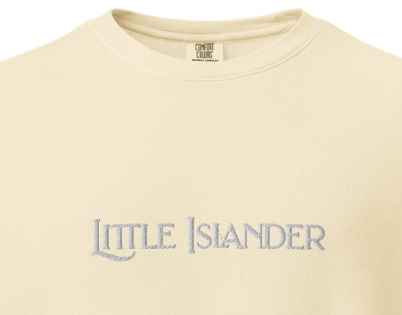 Finished with a delicate embroidered “Little Islander” logo at the center chest, this piece blends understated luxury with laid-back beach vibes. The soft, sun-washed hue adds a touch of coastal elegance—perfect for breezy mornings, seaside strolls, or cozy nights in.