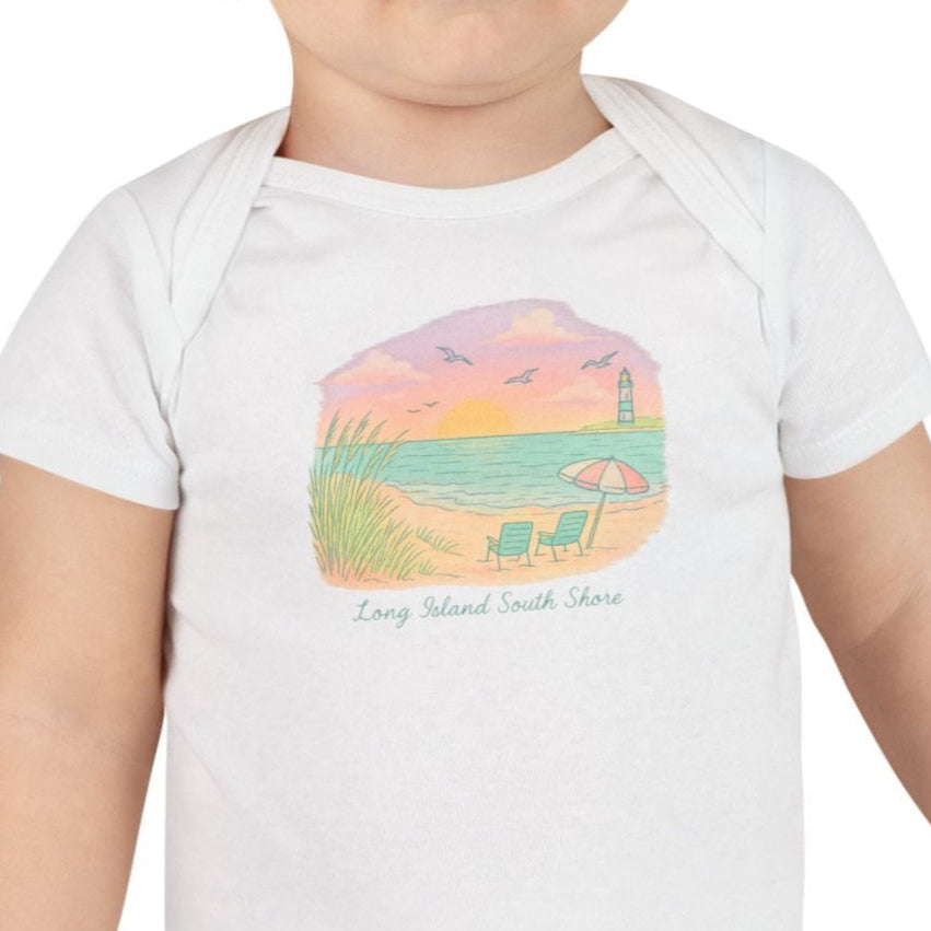 A little piece of the coast for your little one. This soft and breathable Onesie® features a pastel beach scene inspired by Long Island’s iconic South Shore—perfect for snuggles, strolls, and sunny-day memories.